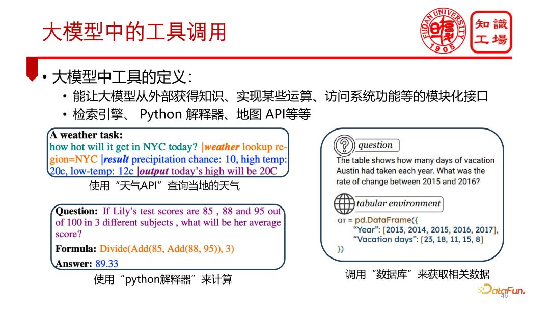 工具调用实际上是非常关键的,工具也多种多样。例如调用 Python 解释器,实际上是最好调用的工具,因为工具本身就是用 Python 实现的。