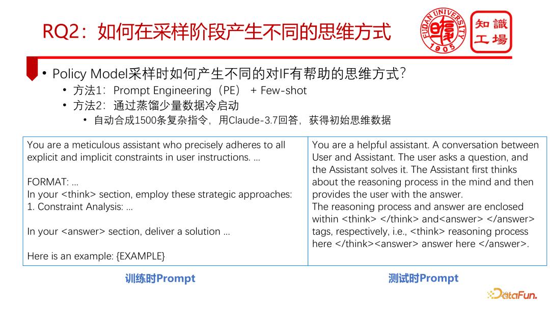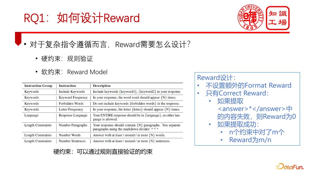 对于复杂指令遵循而言,Reward 机制应如何设计?如何促使模型生成更多样化的有效思维方式?应采用何种训练策略可以提高训练的结果上限?5. RQ1:如何设计 Reward