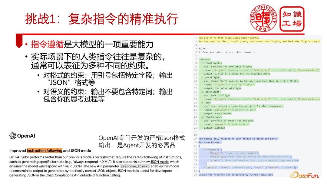 在实际行业场景中,人类发出的指令往往非常复杂。最典型的例子是 OpenAI 及其他一些公司在发布会上重点强调的:他们的模型会专门设有一个开关,打开后可以 100% 获得 JSON 格式的输出。作为 Agent 开发者都知道,这种保证是必不可少的。