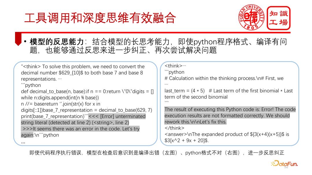 为了证明工具融合是更顺滑的,我们提供了一个典型案例:该模型具备一定的反思能力,包括在出错时主动调用反思机制。当工具调用功能融入后,模型自发实现了反思能力与工具调用的有机结合。