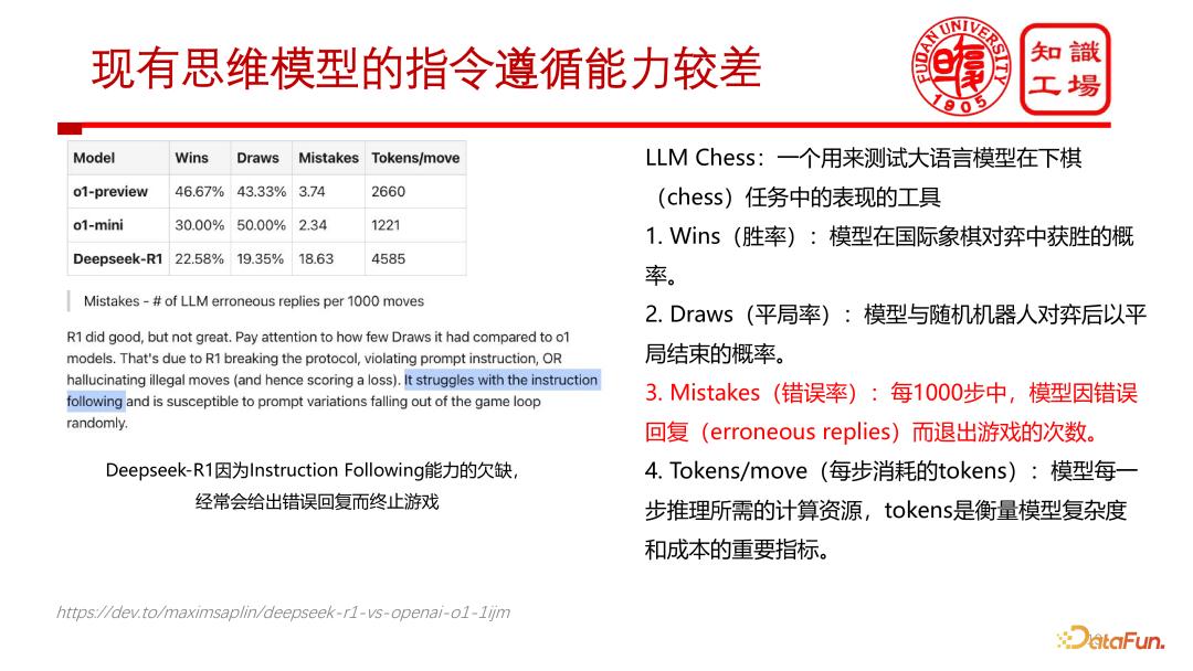 实际上并非如此。这是 DeepSeek 发布后的一项研究内容,该研究让 DeepSeek 进行下棋任务。具体下棋表现如何我们暂且不论,但我们需要重点讨论的是:它是否按照下棋规则进行对弈?研究数据显示,DeepSeek 在遵循下棋规则方面确实存在一些问题,其错误率相对较高。