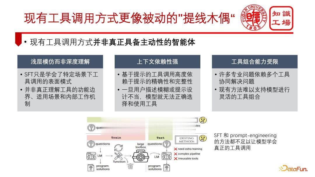 第三个核心挑战在于工具调用能力的实现。虽然工具调用并非新课题,但在RL应用前,现有方法主要依赖 prompt 工程或 SFT,他们的本质问题是僵硬——无法实现工具调用能力的泛化,难以智能地选择和使用工具,仅能进行机械模仿。