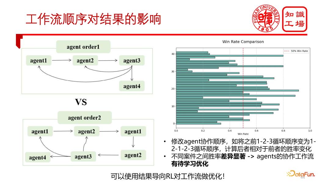 在上面的图中右侧图表展现出:当修改 Agent 内部角色的协作顺序后,胜率变化非常显著。这意味着,我们可以运用 RL 来帮助寻找不同场境下的最优协作顺序。目前,这个工作正在进行中,获得初步成效,暂不展示具体数据结果。