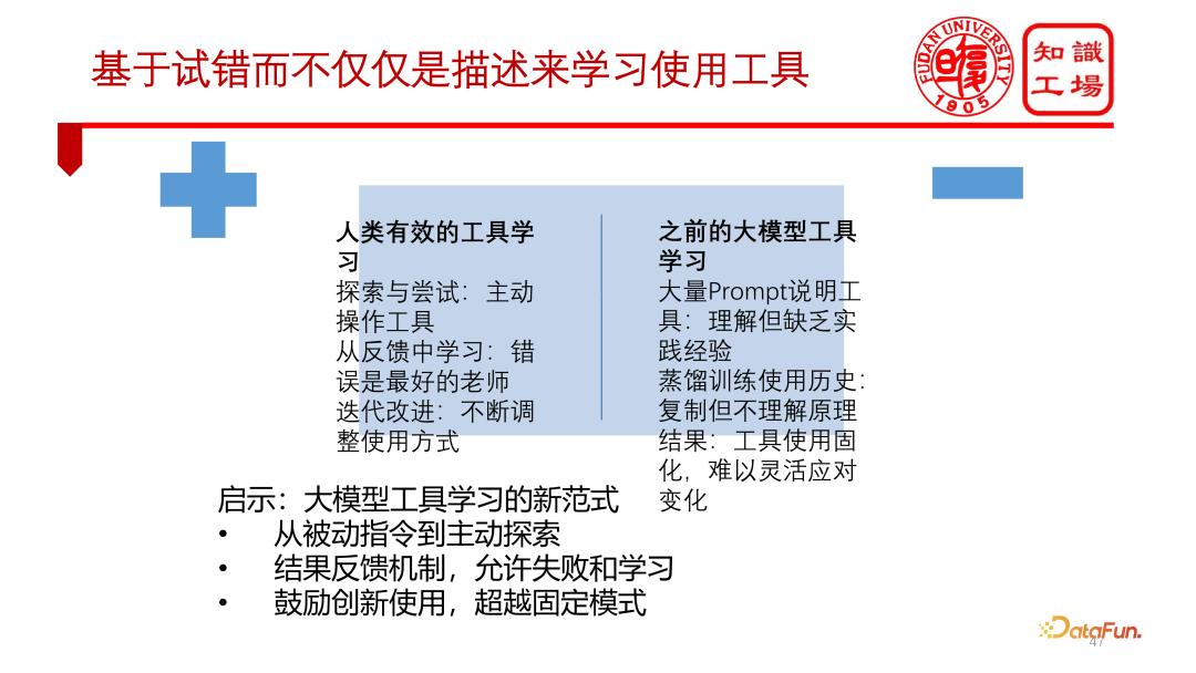 何时需要调用工具?以财务领域为例,专业财务人员必然会使用计算器,但并非每次计算都会使用。对于简单计算可直接计算,复杂计算才需借助工具。因此,调用时机的判断至关重要。调用何种工具?当存在多个可用工具时,如何进行工具选择?如何设置工具调用的参数?这也是当前工具调用系统最欠缺的环节:如何将工具调用的结果反馈至模型的思考过程中?例如,数学家会使用计算器辅助思考,但其最终目标是完成数学证明而非计算结果。在整个证明过程中,计算器仅作为思考辅助工具被频繁使用。03