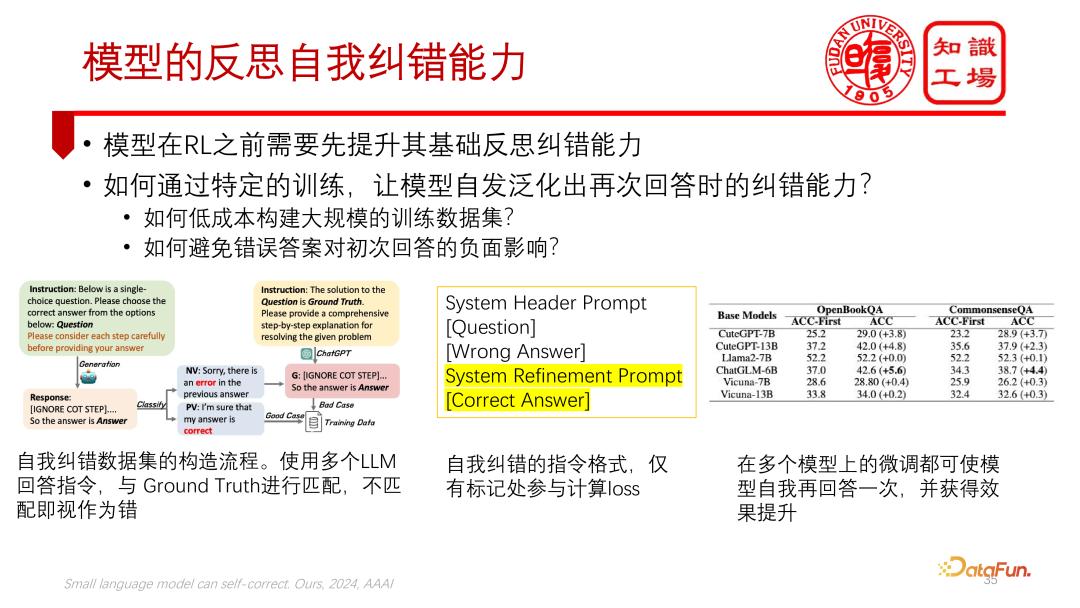 那么,如何通过特定训练使模型自发泛化出纠错能力呢?换言之,我们希望当要求模型反思并给出新答案时,它能提供更优的解决方案。为此,我们可以很容易构建这样的训练数据:让模型首先生成错误答案,再要求其反思并输出正确答案。虽然错误答案和正确答案都易于收集,但在训练过程中需谨慎避免对错误答案求导,以防模型学习错误模式。通过这种简单的指令微调,即可使模型在收到反思指令时提供更优质的答案。