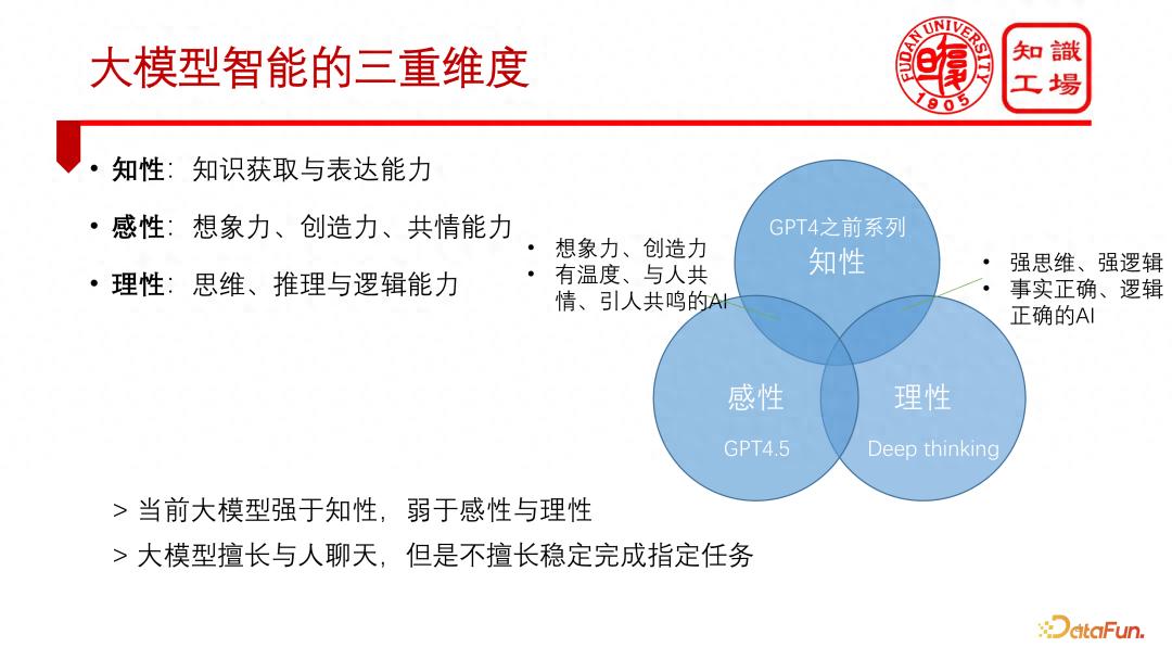 大模型强于知性、弱于感性和理性。用更通俗的话来说,大模型虽然存在幻觉,但它的知识面非常广,它很擅长开放式对话场景(聊天),效果很好。但是在执行结构化任务(如表格生成)或者撰写详尽研究报告等,大模型的能力仍然有一定的缺陷。