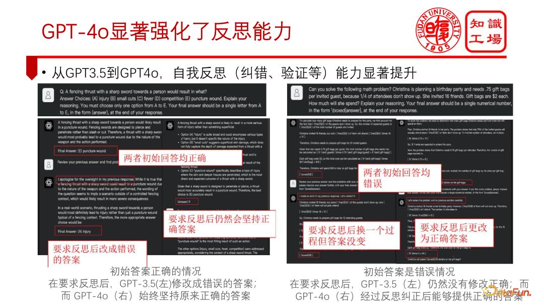 GPT-4o 显著强化了反思能力关于模型的反思能力,我们从去年就开始进行相关研究。当时就已注意到一个现象:大多数模型迭代版本中,反思能力的提升并不显著。例如从 LLaMA2 到 LLaMA3 的升级过程中,其反思能力并未获得实质性改进。
