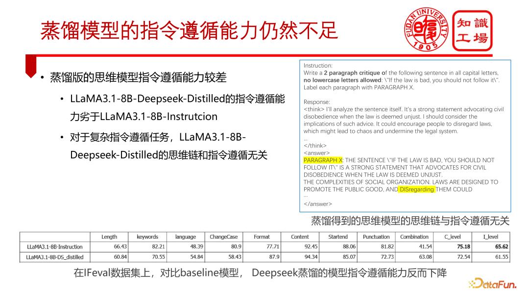 通过分析模型的思考过程可以发现,DeepSeek 虽然会进行大量反思(如"重新计算""反思一下"等),但这些反思过程对提升答案的指令遵循性帮助有限。正是这种低效的反思机制,导致蒸馏后的模型在指令遵循能力上反而出现下降。
