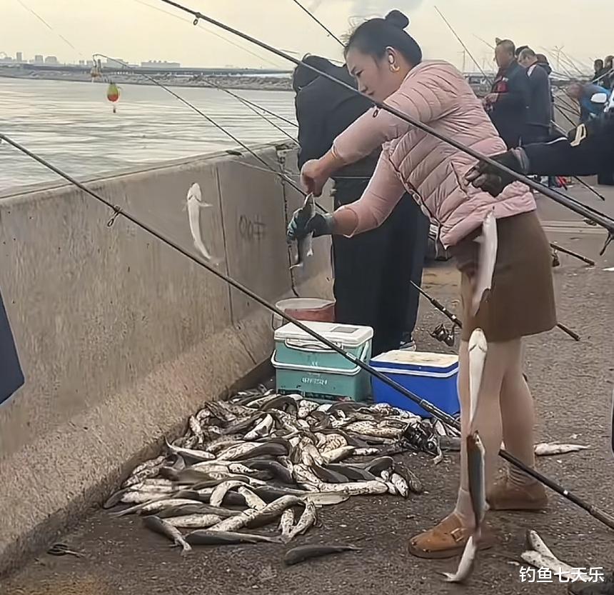 视频里的几位钓鱼人,手里的鱼竿就没闲过,钓上来的鱼来不及装,只能随手放在地上,然后赶紧去钓下一竿。