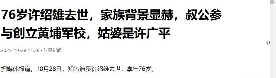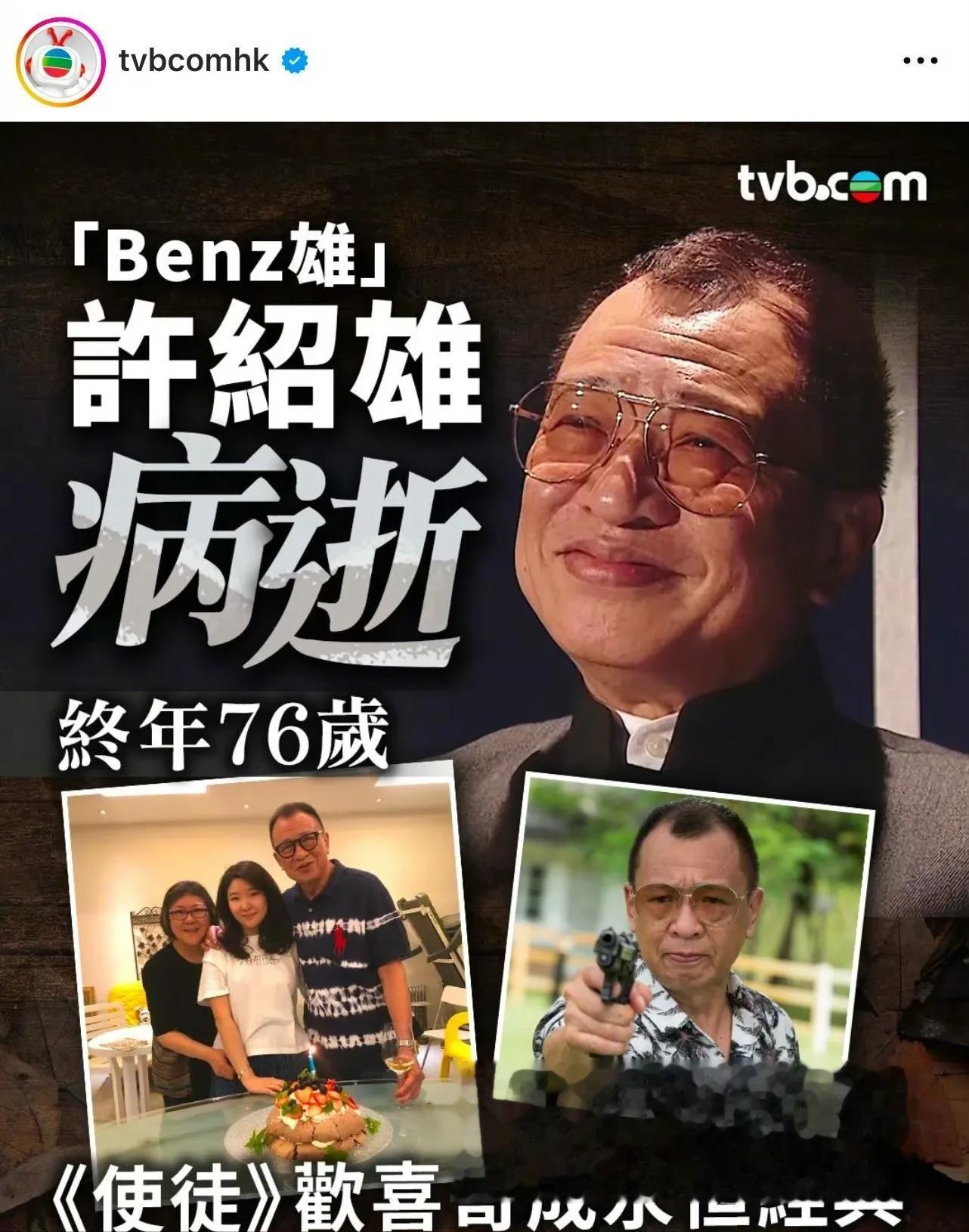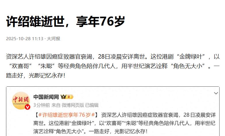 根据港媒报道,资深艺人许绍雄因癌症导致器官衰竭,于2025年10月28日安详离世。