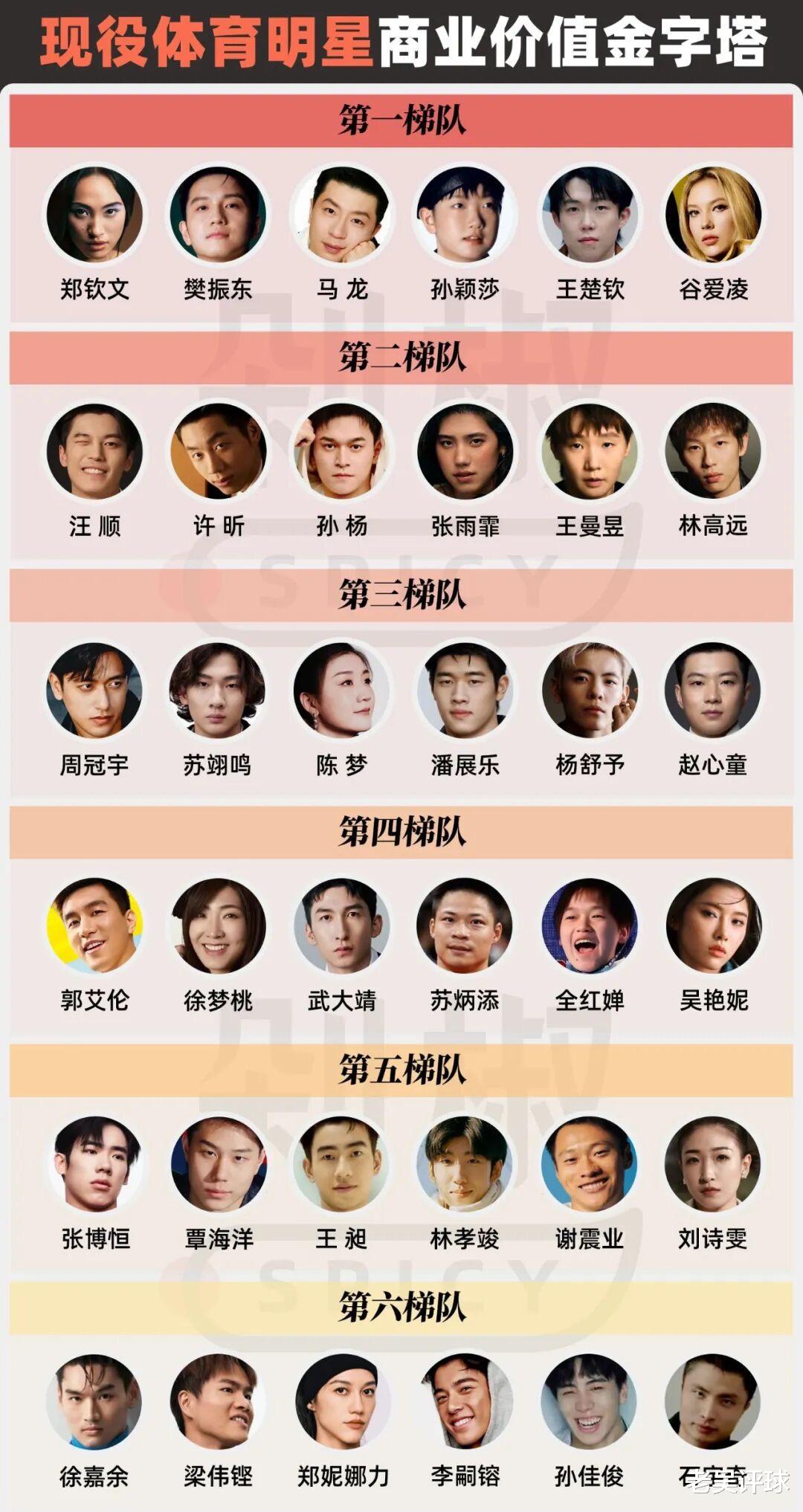 第三个消息,中国现役体育明星商业价值,位于第一梯队大部分都是乒乓球运动员,还有两位是网球的郑钦文和自由式滑雪的谷爱凌,第二梯队被游泳运动员和乒乓球运动员占据,看来国乒选手的商业价值确实是厉害。而篮球运动员只有杨舒予和郭艾伦上榜。