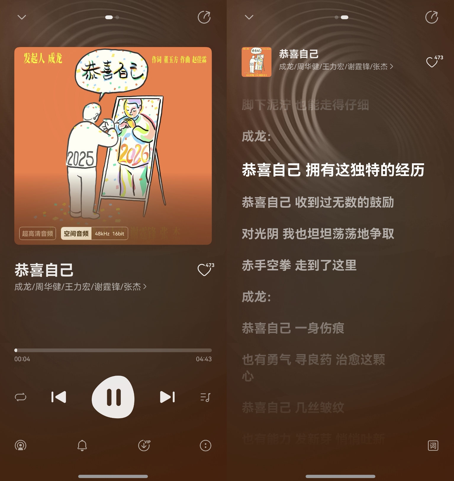 这首《恭喜自己》演唱者的年龄横跨五零后到八零后,涵盖了不同人生阶段,再加上周华健的醇厚、王力宏的透亮、谢霆锋的磁性、张杰的抒情,以及成龙大哥那股子江湖气这各具特色的五种声线,听起来更有味道。打开每首歌都有的超高清音频来听,连一些对声音的细节处理,都能让我这个外行人听出来门道,听感真的很绝!