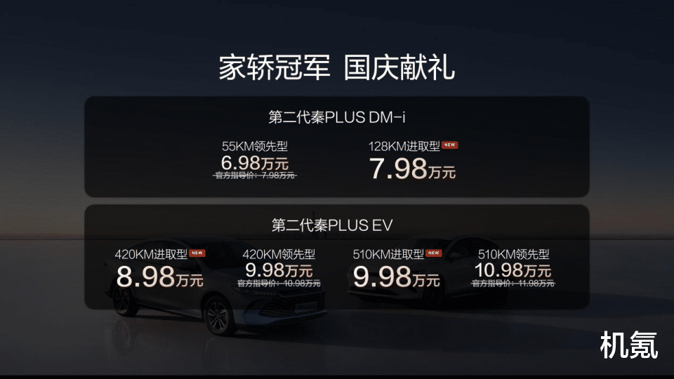 秦PLUS DM-i新增了128KM长续航版本,百公里亏电油耗仅2.69L,继续升级续航和节能;纯电EV这儿推出420KM与510KM两款进取型,全系新增怀挡设计与星河米车色。在智能辅助驾驶和智能座舱上,优化了行车辅助驾驶和智能泊车,新增了手车互联,未来还会进一步升级座舱体验,当然这些升级也都会照顾到其他第二代秦PLUS的老车主们,OTA一个都不会落下,现在高品质家轿的门槛已经让比亚迪拉到“6”字开头了,看看友商们怎么接招吧。