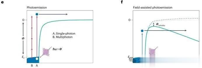 图 1 e-f 分别为 TEG(图 1e)和 FEG(图 1f)中电子跃迁的能量态势图:激光脉冲帮助电子克服针尖逸出功(Φ)后,从导带(费米能级 EF 处)跃迁至真空能级(0 eV)。脉冲工作模式下,第一阳极电压会降低;场辅助光发射中,激光电场的偏振方向与引出电场对齐(见图 1b),紫外光子帮助电子降低并突破隧穿势垒,最终发射出来。