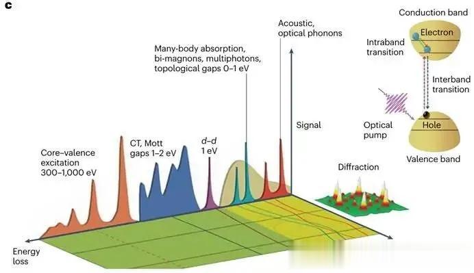 图 2 | c 固体中电子 / 结构与磁激发的分类图谱,图中呈现了材料中各类激发的能量 - 动量分布,清晰标注了结构、磁、电子等集体模式,以及带间跃迁、芯能级激发的能量范围。