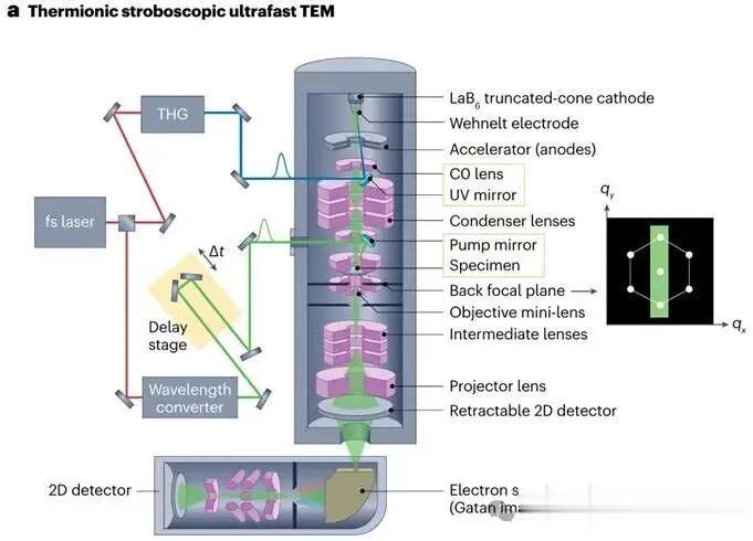 图 2 | a 热电子枪 UTEM 示意图,其核心结构和 TEM 一致,包含电子枪、聚光镜系统、物镜成像系统、中间镜与投影镜系统,以及探测器。黄色方框标出了 TEM 镜筒的改造部位,这些改造让激光能抵达平面光电阴极和样品区域,使仪器具备超快泵浦 - 探测频闪功能。注:THG = 三次谐波产生,UV = 紫外光