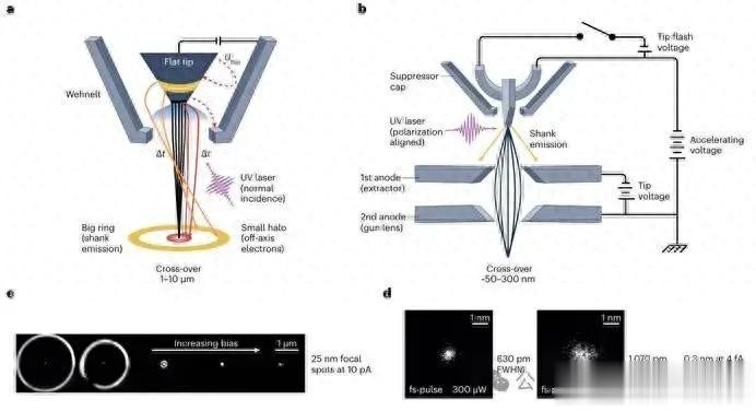 图1 | UTEM用电子枪:a-d 为热电子枪(TEG,图 a)和场发射电子枪(FEG,图 b)的结构示意图,以及对应的电子发射图案(TEG 为图 c、FEG 为图 d)。