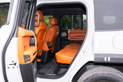 车尾则保留了硬派越野车的经典元素,侧开尾门和外挂备胎的设计满足了越野场景的使用需求,竖置尾灯还具备显示个性化图案和文字的功能,在车队出行或朋友结伴游玩时,可用于显示车队编号或应景图案,增加了使用中的趣味性。