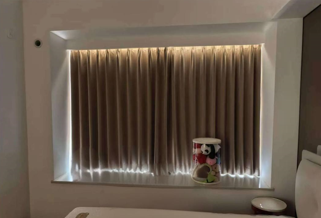 再看两边和底部的漏光问题,这也是传统窗帘的通病。中波帘侧边做了柔性压边条,能紧紧贴住墙体,不管是飘窗的直角边还是轻微不平整的墙面,都能贴合得很好,从根源上杜绝侧缝漏光。底部的闭合设计也很贴心,帘布放下来后能和窗台精准贴合,不会像普通窗帘那样留个小缝,光线根本钻不进来,真正实现全遮光效果。
