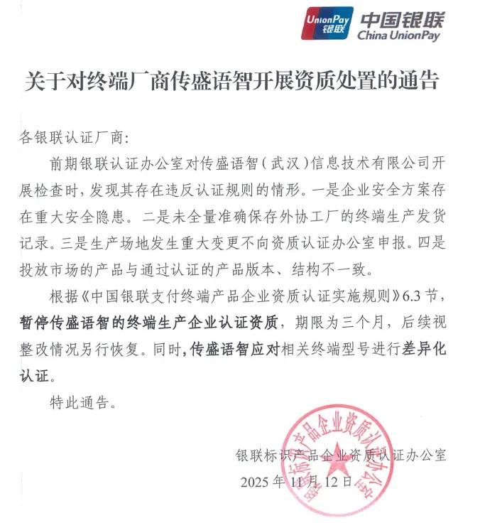 11月13日,银联标识产品企业资质认证办公室发布了“关于对终端厂商传盛语智开展资质处置的通告”。