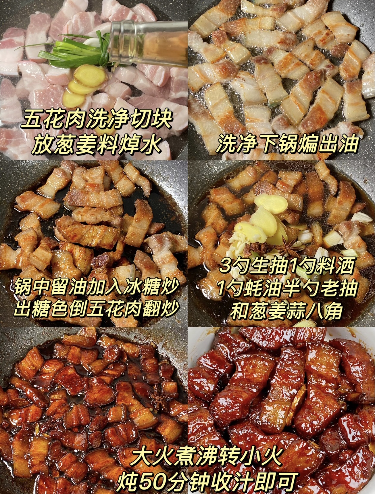 接下来就是调味增香。往锅里加入3勺生抽、1勺料酒、1勺蚝油、半勺老抽,再放入姜片、葱段和一颗八角,翻炒均匀,让每一块肉都充分吸收酱汁的香味。生抽提鲜,老抽上色,蚝油增香,料酒去腥,几种调料的比例刚刚好,不用额外加盐,味道就足够浓郁。然后往锅里加入开水,水量要完全没过五花肉,大火把锅里的汤汁煮开,这时候可以尝一下汤汁的味道,根据自己的口味稍微调整,然后盖上锅盖,转成最小火,开始慢炖。