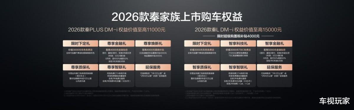 为降低购车门槛,两款车型推出丰厚上市权益。秦PLUS DM-i权益价值至高11000元,含限时购置税补贴、金融贴息、置换补贴及车色免费送;秦L DM-i权益价值至高15000元,涵盖限时购置税补贴、金融贴息、车色免费送,购买210KM云辇型可免费获赠TBC高速爆胎稳行系统,所有权益需在1月31日前下单享受。