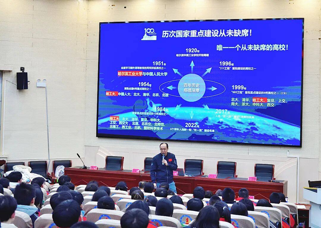 当大屏幕上呈现哈工大在航天探月、机器人、小卫星、高端装备制造等领域取得的一系列里程碑式成果时,报告厅内响起阵阵惊叹。哈工大“国之重器”的背后,不仅是科技实力的彰显,更是一代代哈工大人将个人理想融入国家需要的生动写照;这种一代代传承科研接力、一代代续写强国华章的精神,跨越时空化作榜样的力量,在现场一中学子们心中投下了一束“国之所需,心之所向”的梦想之光,指引着新时代一中学子,心向星辰、脚踏实地,以满怀的热忱勇毅奔赴与家国同行的美好未来。