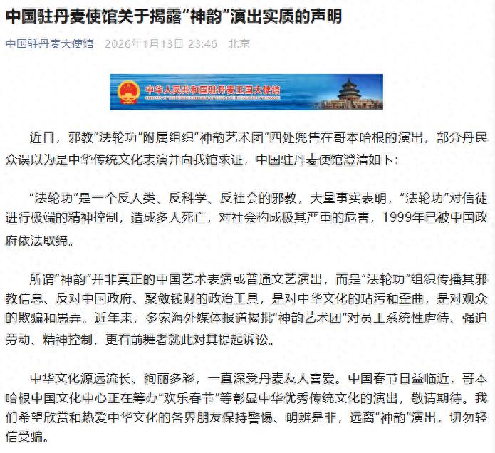 1月13日晚,中国驻丹麦使馆发布关于揭露“神韵”演出实质的声明——