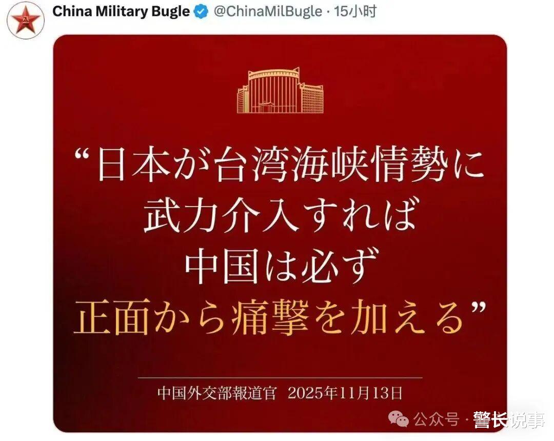 官方媒体迅速营造舆论声势。人民日报发表“钟声”评论,揭露这是1945年以来小日本领导人首次在正式场合鼓吹“台湾有事就是小日本有事”。中国军号在社交平台X上发布了日语海报,明确写道:“如日方胆敢武力介入台海局势,中方必将迎头痛击!