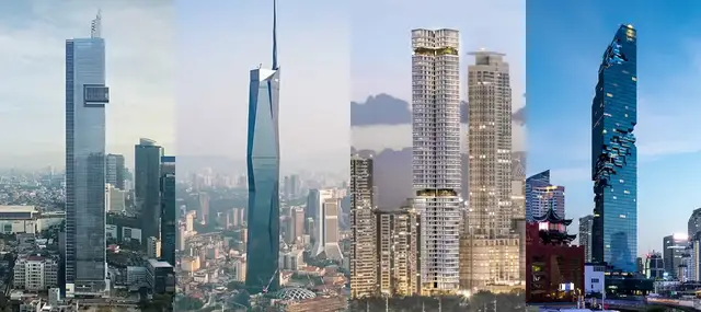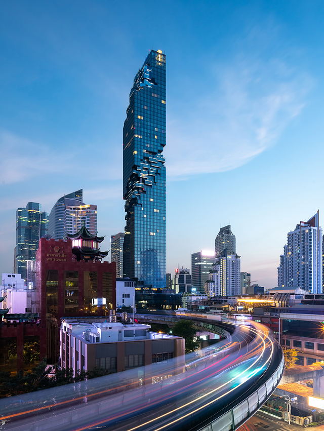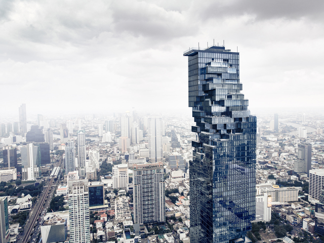 位于泰国曼谷的王权大京都大厦造价达180亿泰铢,高314米,共77层,自2016年落成后便稳居泰国第一高楼。项目由德国建筑师奥雷·舍人设计,大厦采用“侵蚀”设计理念,玻璃幕墙与方块几何结构形成独特像素化效果,故而得名“像素大厦”。