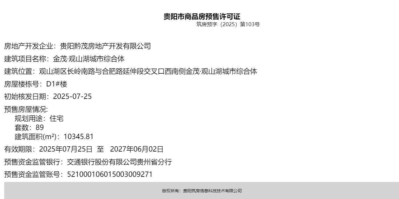 10月29日,据筑房网消息,金茂·观山湖城市综合体新获一张预售证,D1#楼89套住宅即将入市,建筑面积10345.81m²。