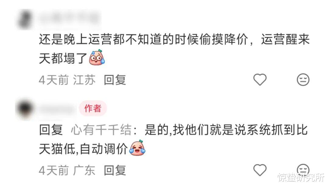 还有商家在回复其他评论时也提到,京东会在晚上运营都不知道的时候偷摸降价,“运营醒来天都塌了”,如果询问采销,得到的回答大概率会是“(被)系统抓到,(得)比天猫低,自动调价”。