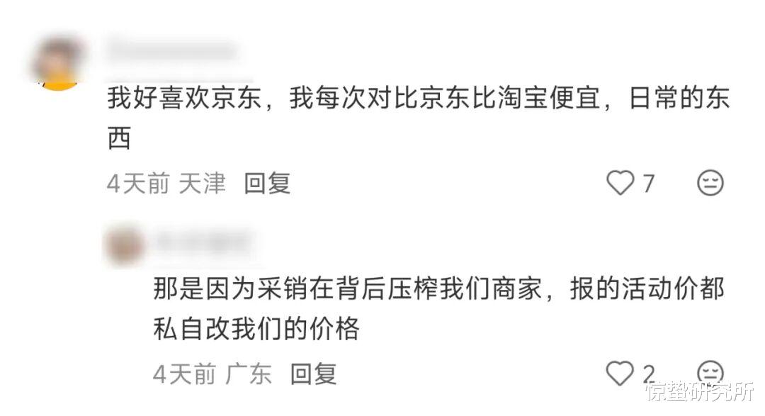 例如有网友提问,自己在京东浏览一两分钟就被平台送券,这些优惠券到底算在谁身上?得到的答案是“商家”。另一位用户表示自己很喜欢京东,每次用京东和淘宝比价都更便宜。而这条评论很快就有商家回复:“那是因为采销在背后压榨我们商家,报的活动价都私自改我们的价格。”