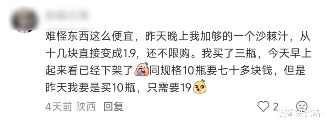 还有一位网友分享,自己最近加购沙棘汁看到原价十几块的商品,突然降价到了1.9元,还不限购,隔天再查看时,该款商品已经下架。而在平时,同规格10瓶装的商品售价为70多元。所以如果用户前一天下单,只需要19元就可以买到原价70多元的商品,而这笔订单给商家带来的是50多元的直接亏损。