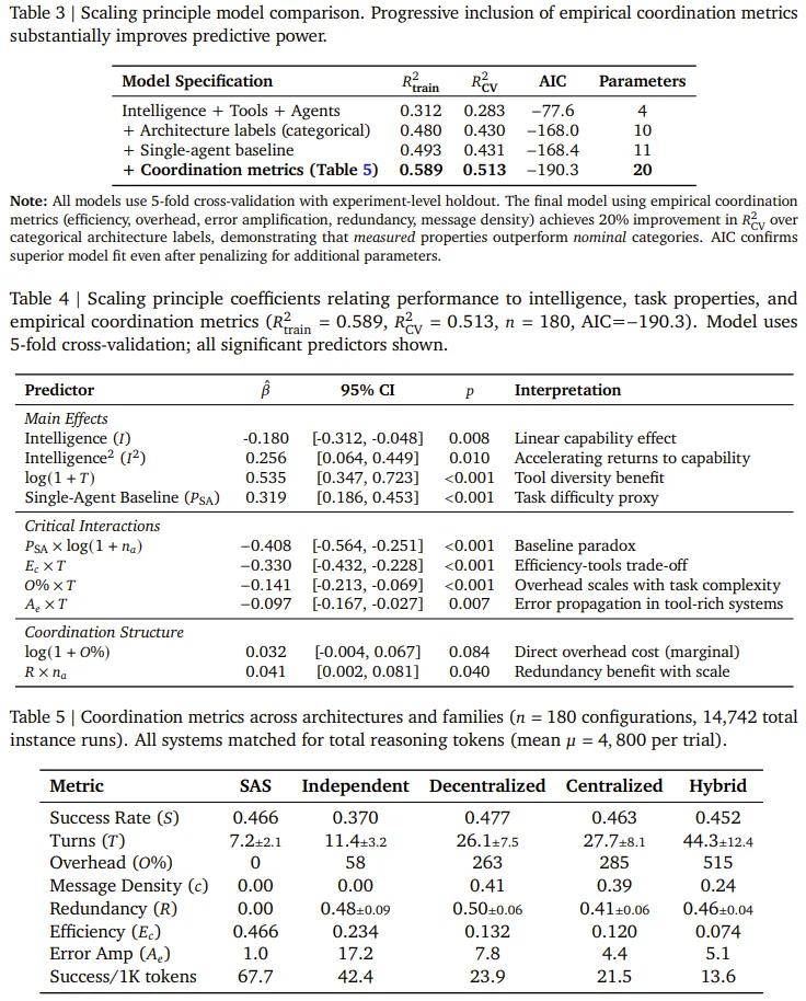 他们使用经验性的协作指标(包括效率、开销、错误放大和冗余)推导出了一个预测模型,该模型实现了交叉验证 R²=0.513,通过对任务属性建模而非过度拟合特定数据集,实现了对未见任务领域的预测。