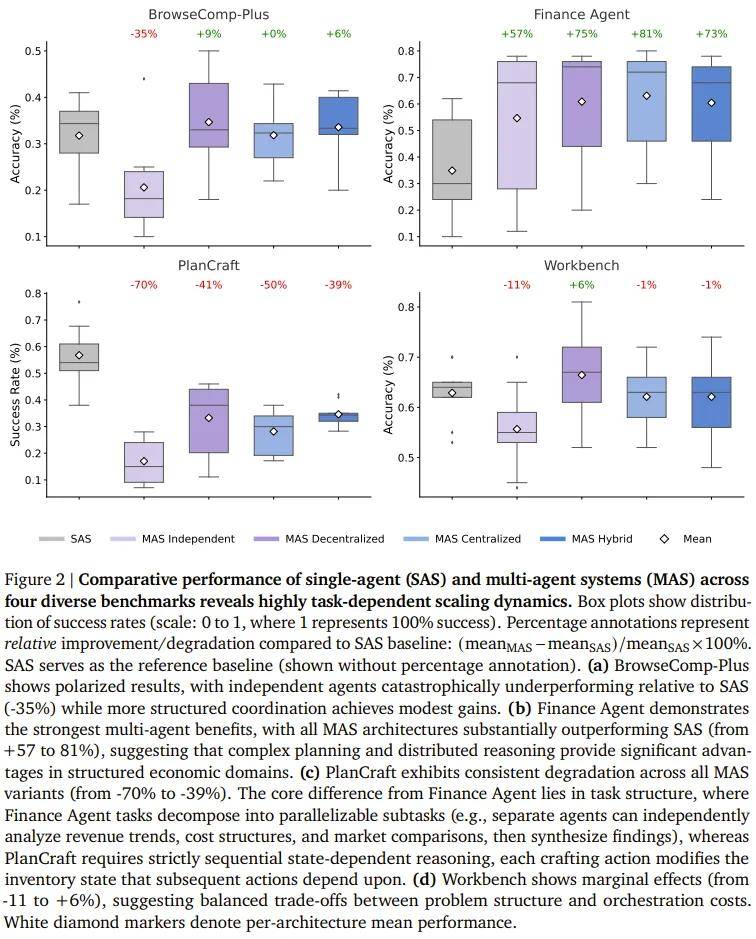 红榜(适合组团): 在金融分析(Finance-Agent)这类任务中,多智能体协作是大杀器。中心化架构(有一个「指挥官」分派任务)能让性能暴涨 80.9%。为什么?因为这类任务可以拆分 —— 你查财报,我算汇率,他做总结,大家并行工作,效率极高。