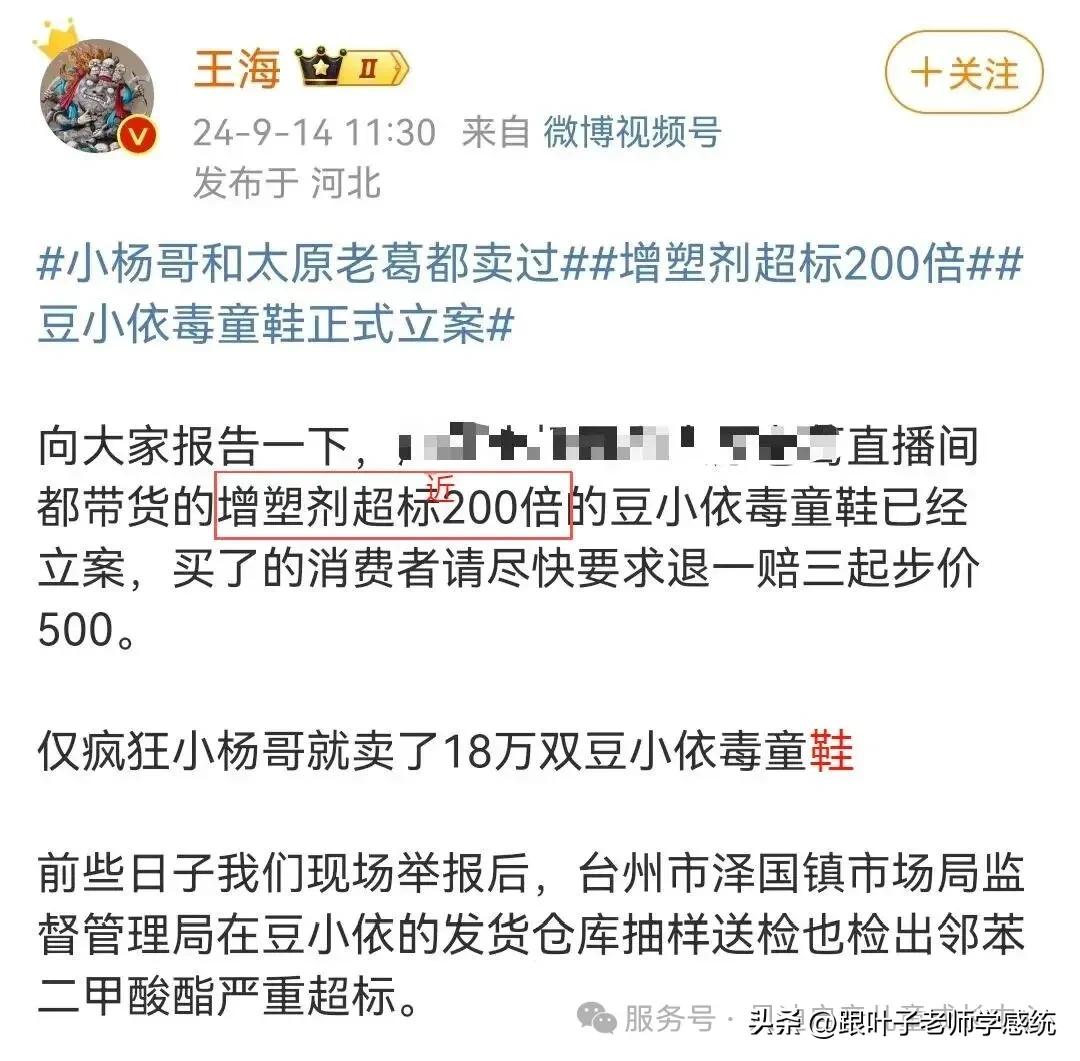 此前,职业打假人王海曾爆料称,某大网红所带货物“豆小依”儿童鞋存在严重问题,其增塑剂含量严重超标。