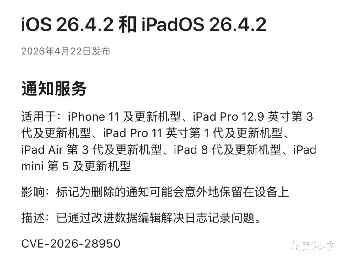 和 iOS 26.4.2 正式版一样,修复了被用户删除的通知可能会意外保留在设备上的问题,以及清除了用户已经删除但意外存储在设备上的所有通知副本。