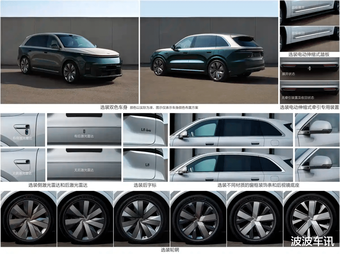 在申报的细节方面,我们可以看到全新一代的理想L8 Livis申报了多款不同风格的车轮毂,造型均非常的干练,并且它的轮毂的特点都很特殊。新车的车身还有很多其它细节有不同类型的装饰,对整车的外观变化倒是没有什么大的影响。全新理想L8 Livis的车身块头也全面加大,它的长宽高分别为5135×2000×1800mm,轴距3045mm,实用性肯定更强。在动力方面,新车搭载的是全新一代的增程器,它的最大输出功率达到了115千瓦,采用72.7kWh 5C三元锂电池,WLTC纯电续航343km。