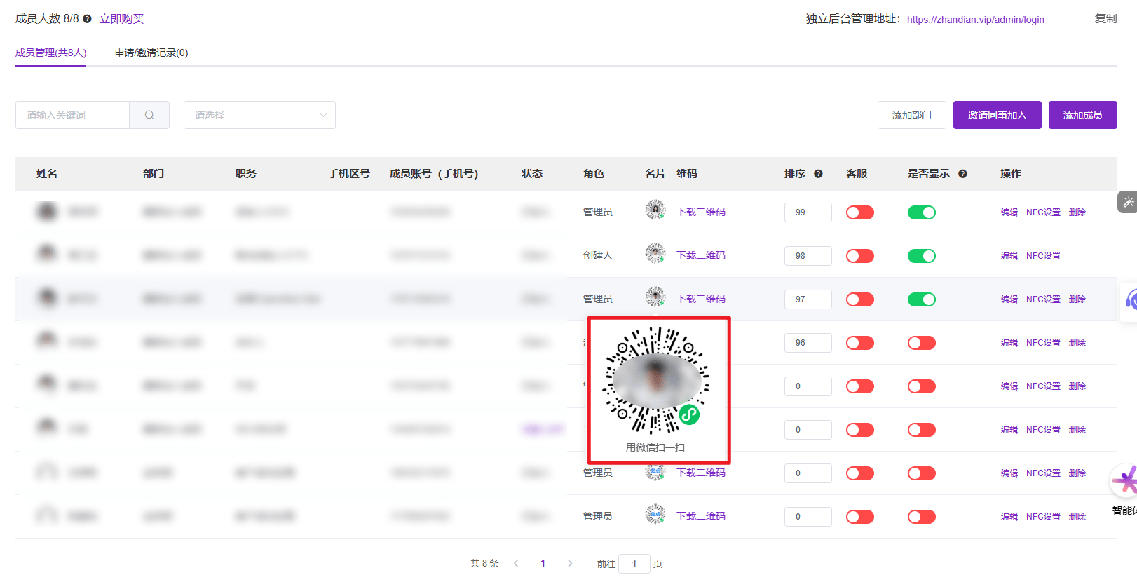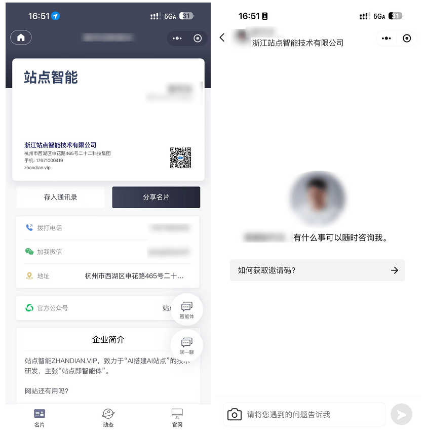 AI 智能体不仅可在官网展示,还能集成到 “官微名片” 功能中。在营销枢纽 - 应用 - 官微名片页面,成员名片会自动关联 AI 智能体入口,客户扫描名片二维码后,可直接通过 “聊一聊” 功能咨询问题(如 “站点智能的 AI 建站有哪些优势?”),实现 “商务社交 + 智能咨询” 无缝衔接,提升客户沟通效率与转化概率。