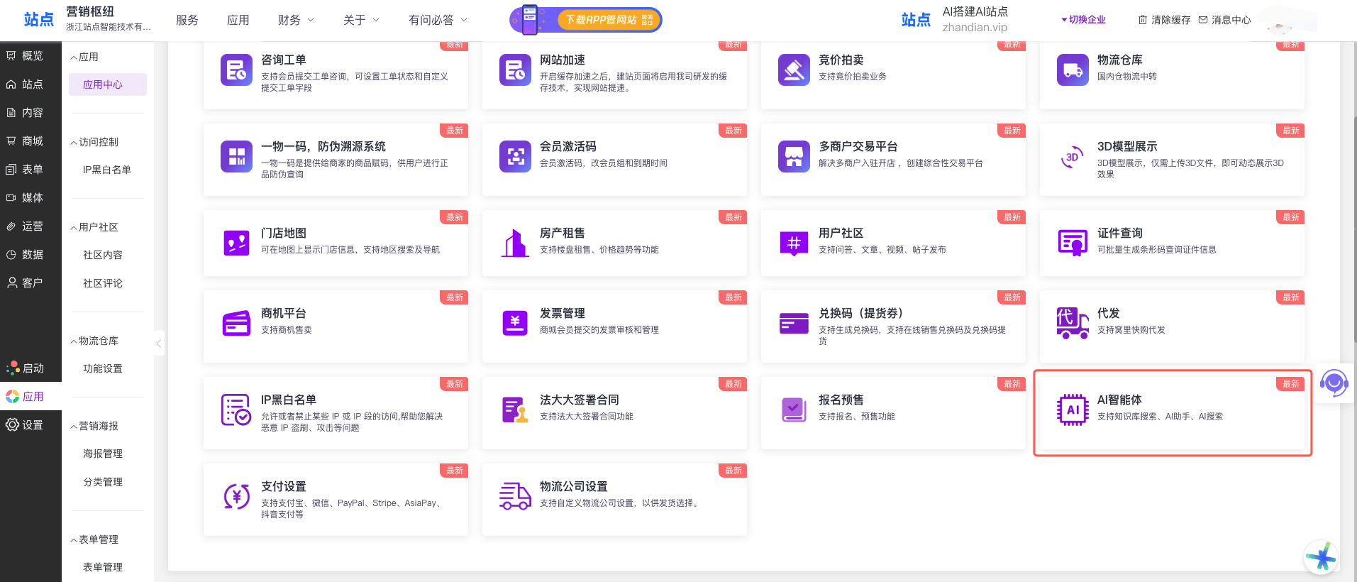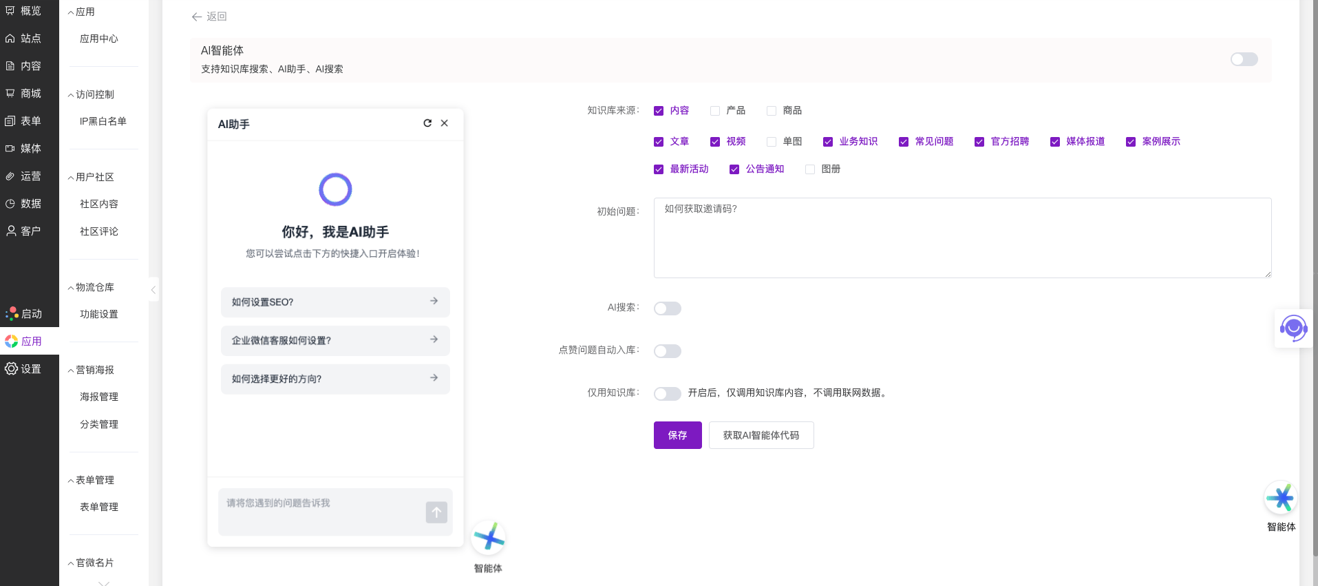 AI 智能体是站点的 “智能客服 + 知识库助手”,支持 7x24 小时响应用户咨询,操作位置为营销枢纽 - 应用 - AI 智能体,同时可集成到官微名片,实现多场景智能交互。