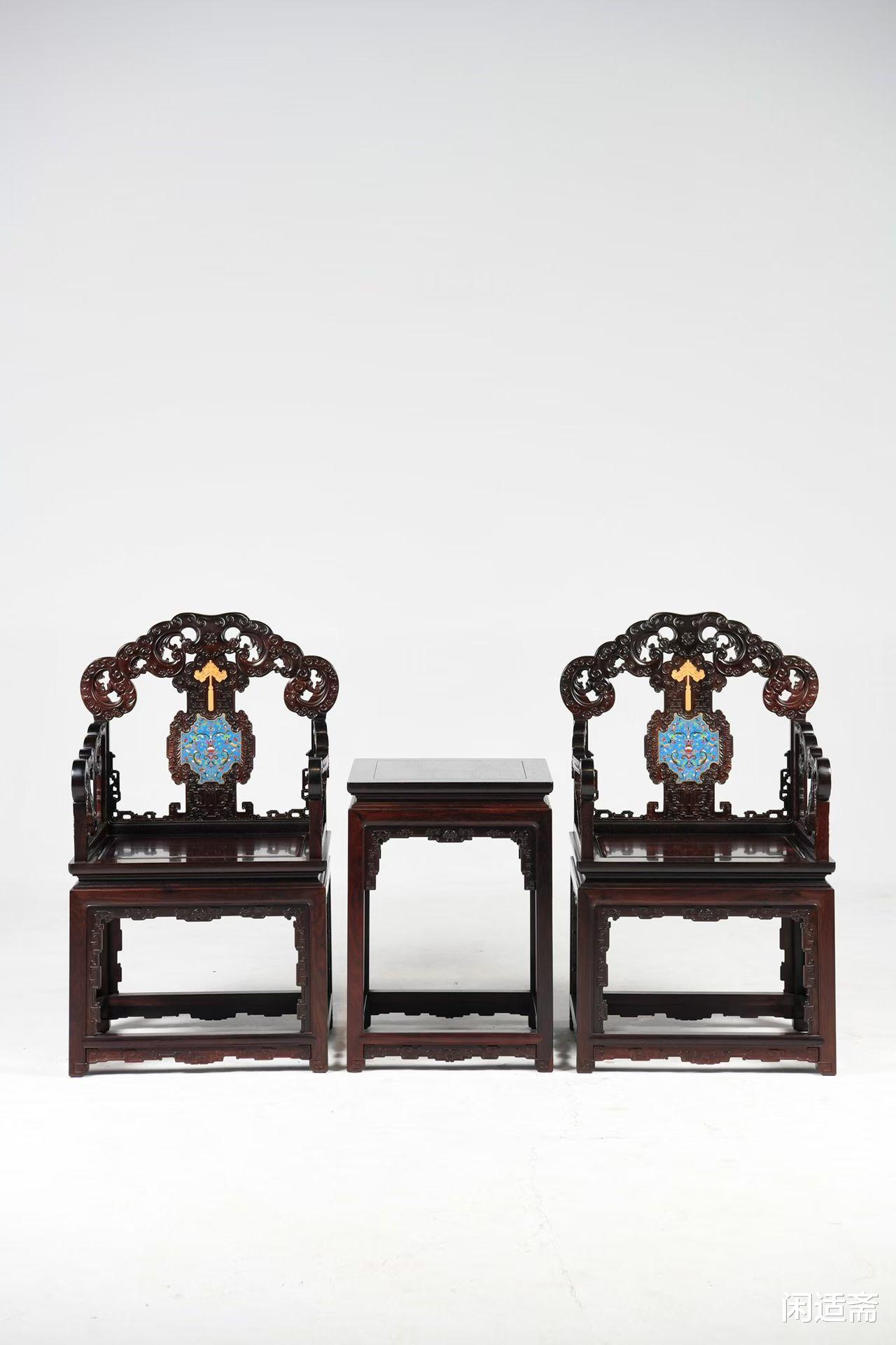 靠背中间位置采用景泰蓝镶嵌工艺,将传统珐琅艺术与木作工艺完美融合。景泰蓝以铜为胎,以釉为彩,经掐丝、点蓝、烧蓝等多道复杂工序制成,色彩艳丽却不失雅致,图案精美且富有层次感。镶嵌于靠背之上的景泰蓝饰件,纹饰为缠枝莲纹,线条流畅,色彩饱满,与小叶紫檀的深沉色泽相互映衬,既打破了木作的单调感,又增添了器物的华丽感,让太师椅在端庄中透出几分灵动与精致。中间茶几方正,束腰,四面置平底枨,与扶手椅搭配融洽。