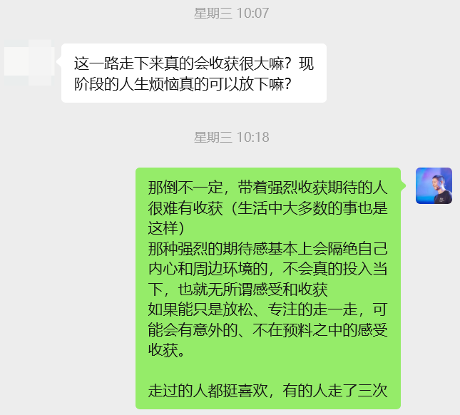 带着强烈收获期待的人,去旅行、去参加学习、去参加一个活动,大多很难有收获(生活中大多数的事也是这样)当自己带着强烈期待参与一个活动时,身心并没有真的参与,脑海中不断浮现的是,这和我想的不一样啊、我想要的感受和收获怎么还没浮现!这种强烈的期待感,基本上会隔绝自己内心和周边环境,让自己不会真的投入当下,也就无所谓感受和收获当我的脚踩在沙子上,我不是在感受沙子,我在想收获当我的眼睛看到小花开缝隙中,我不是在感受花朵,我在想收获我的身体在这里,但我的心不在,没有和天地在一起,我不会有收获