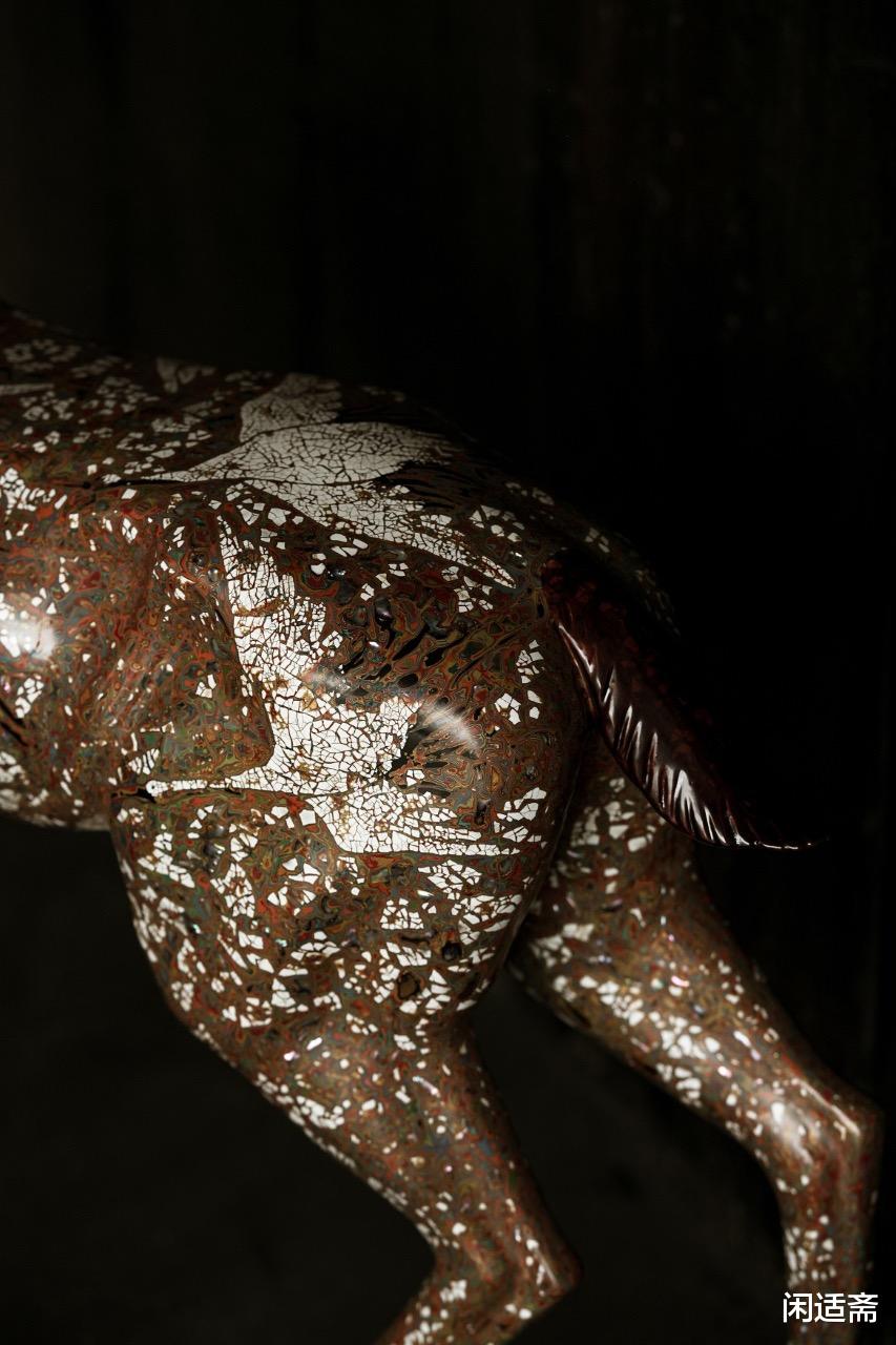 此件九色鹿制作工艺考究,以黄铜为骨,采用失蜡铸造的工艺制作。鹿身表面再以非遗大漆髹饰,取天然生漆经 “三磨三滤” 精制,先以朱红为底,再用彰髹工艺铺展漆层,同时选用色泽温润的鸡蛋壳,浸泡去膜后细细捣碎,正贴留隙间,自然冰裂纹如流云萦绕。十二道髹漆反复晾晒打磨,再以蜂蜡推光百次,蛋壳的莹白与漆层的琥珀色交融。