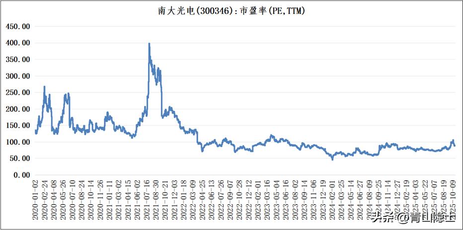 从估值维度审视,南大光电过去五年收入与净利润增速均维持在约30%的水平。若遵循PEG等于1的经典估值原则,其合理市盈率应处于30倍上下。然而,回顾过去五年的市盈率变动轨迹,除2024年初短暂跌破50倍关口外,其余大部分时间,南大光电的市盈率均稳居60倍及以上高位。截至10月21日,其市盈率(TTM)更是攀升至约88倍。若以此为参照,南大光电的PEG或需调整至2方显合理,尽管目前对此尚无法给出确切解释,但是“存在即为合理”,市场既然如此定价,肯定有其合理性。