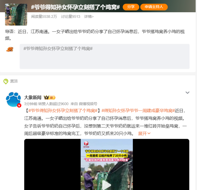近日,江苏南通一则暖心视频刷屏网络。女孩将怀孕的喜讯告诉爷爷奶奶后,满心欢喜分享幸福,却没料到长辈的爱意来得质朴又厚重。第二天一早,爷爷便运来满满一车红砖,亲手丈量、砌墙、封顶,耗时一周搭建出规整又结实的豪华鸡窝,随后又精心购入二十只小鸡悉心喂养。