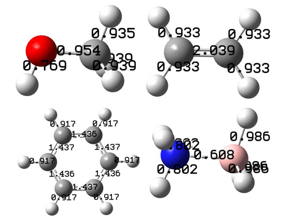 Wiberg键级:常用于自然键轨道(NBO)分析,通过Gaussian等软件计算,适用于量化键的共价性和离子性贡献。例如,在氨硼烷(NH₃BH₃)中,Wiberg键级能区分配位键的强度。