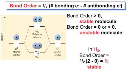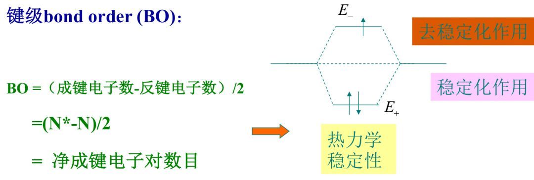 例如,在氢气(H₂)分子中,成键轨道有2个电子,反键轨道无电子,键级为1,表示一个稳定键;在氦气(He₂)分子中,成键和反键轨道各有2个电子,键级为0,因此He₂分子不存在。