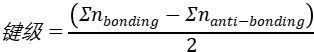 键级通常定义为成键电子数(bonding electrons)与反键电子数(anti-bonding electrons)差值的一半。公式表示为: