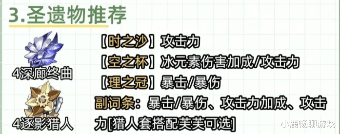 特殊玩法:若采用“逐影猎人”4件套追求极致重击暴击,在特定的速切爆发流程中,攻击杯的收益也可能更突出。